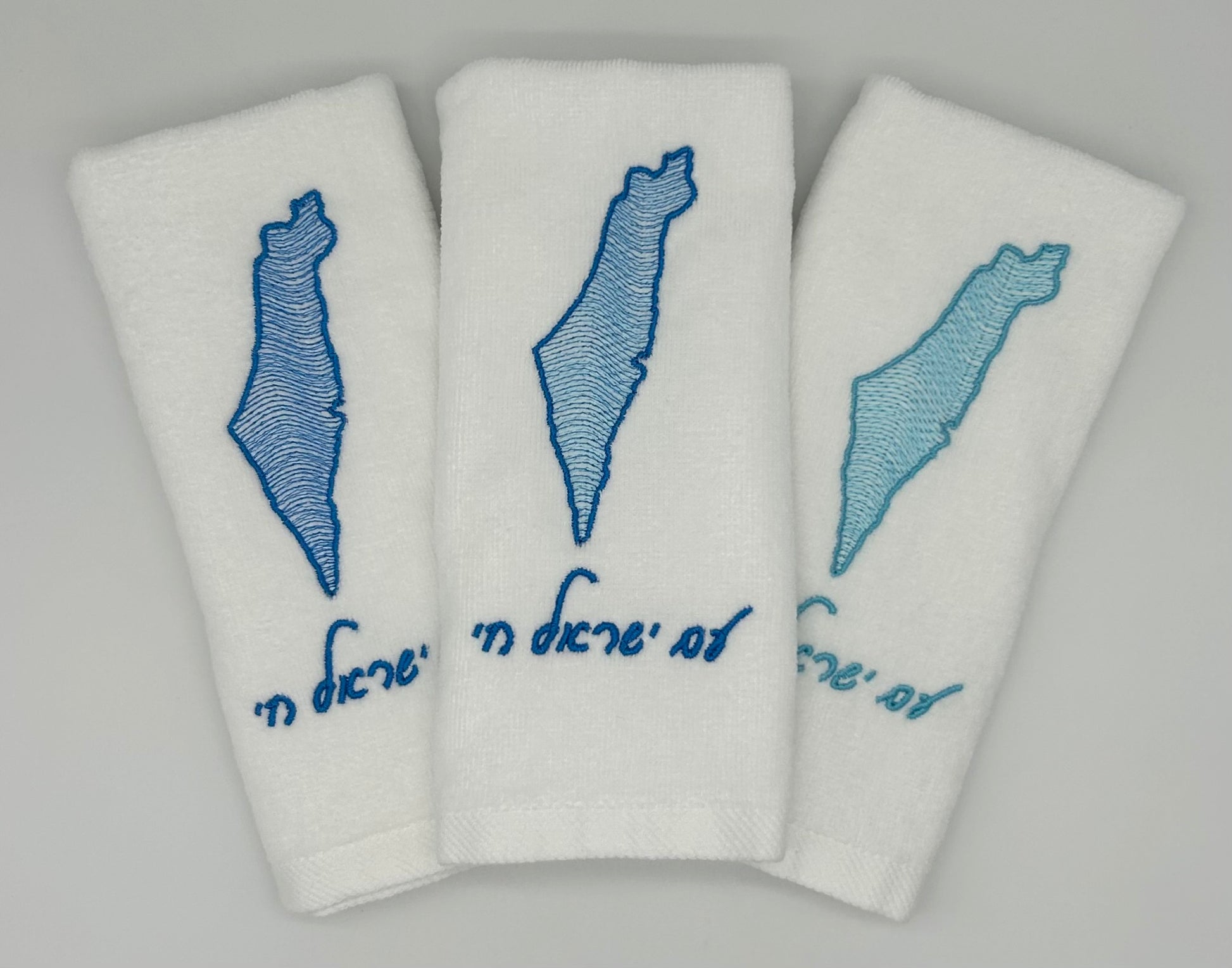 Pure cotton hand towel featuring waves flowing over the map of Israel, in shades of classic or vibrant blue. Available with or without text, with different text options to choose from or the option to customize with your own text in Hebrew or English.